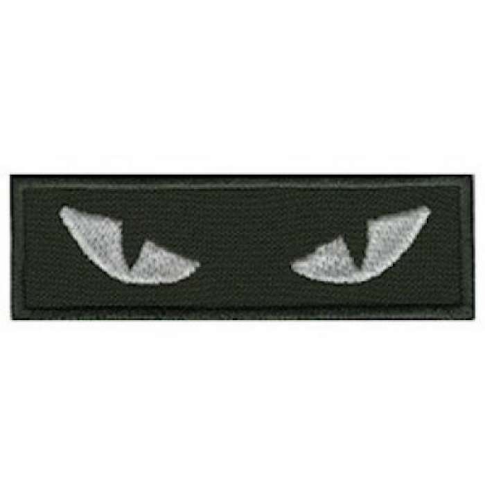 Нашивка розміром 8*2,5 см на липучці. На тканиі олив, по центру, вишиті очі кішки світлонакопичувальними нитками.