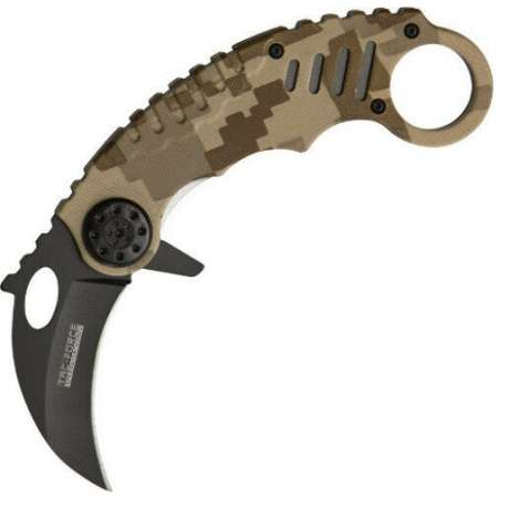 Автоматичне відкривання. 12,7 см у закритому стані. 8,89 см чорне частково зазубрене лезо танто з нержавіючої сталі 8Cr13MoV. Чорна і зелена прогумована алюмінієва рукоятка. Кріпильна кліпса. Шип для великого пальця. Кишенькова кліпса.