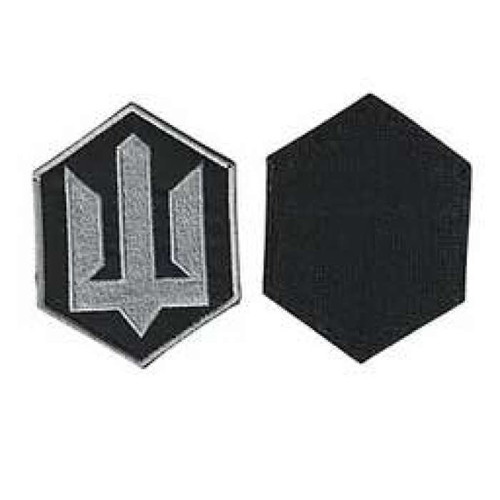 Шеврон шестигранний, 9*7 см, на чорному фоні, в центрі вишитий тризуб білими нитками, на липучці.