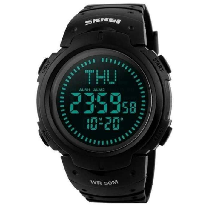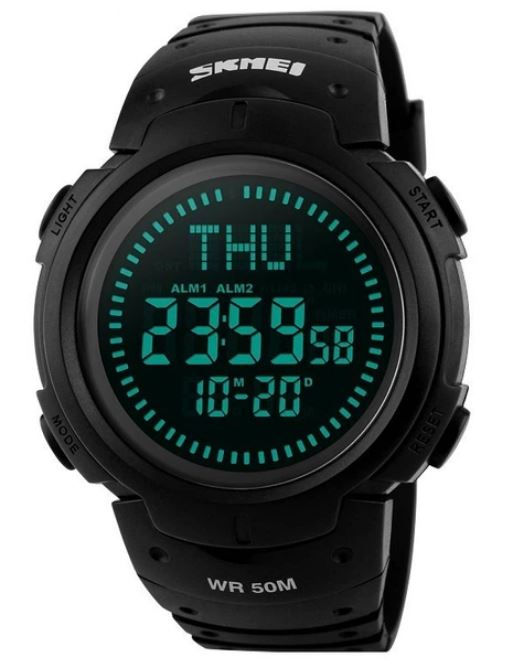 Годинник Skmei 1231BK — це стильна та функціональна модель. Його практичність, надійність і сучасний вигляд роблять його ідеальним супутником як у спорті, так і в повсякденному використанні. Годинник оснащений електронним механізмом, що гарантує точність показників і простоту у користуванні. На цифровому дисплеї відображаються години, хвилини, секунди, дата, день тижня, місяць і рік. Модель має широкий набір функцій: компас, секундомір, таймер, будильник, світовий час і електролюмінесцентне підсвічування, що забезпечує зручність навіть у темряві. Формат часу можна вибрати — 12 або 24 години. Корпус годинника виготовлений із міцного полімеру армійсько-зеленого кольору, стійкого до ударів і подряпин. Полімерне скло надійно захищає екран від механічних пошкоджень. Ергономічний ремінець із каучуку також виконаний у болотному кольорі, приємний на дотик і забезпечує комфортне носіння навіть під час тривалих тренувань чи походів. Діаметр корпусу становить 47 мм, вага — лише 60 г, завдяки чому годинник зручно сидить на зап’ясті, не створюючи відчуття тяжкості. Водонепроникність 5 ATM (50 метрів) дозволяє користуватись ним під час плавання, занять спортом або в дощову погоду. Годинник постачається з батарейкою CR2025, інструкцією та транспортувальним пакетом.