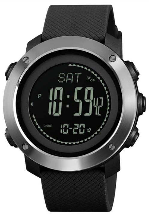 Skmei 1418BK - це чоловічий спортивний годинник від відомого виробника Skmei. Вони поєднують у собі стильний дизайн та високу функціональність, що робить їх незамінними для активного способу життя. Годинник оснащений електронним циферблатом і пропонує широкий набір функцій. Вони мають будильник, альтиметр, барометр, другий часовий пояс та відображають рік, дату, день тижня, місяць та секунди. Крім того, у них вбудований компас, який допоможе вам визначити свій напрямок у будь-якій ситуації. Додатково годинник має лічильник калорій, таймер, термометр, фітнес-трекер і крокомір, що дозволяє відстежувати фізичну активність і досягати своїх спортивних цілей. Вони також дозволяють контролювати погоду, що є корисною особливістю для мандрівників та любителів активного відпочинку. Годинник має водонепроникний корпус та протиударну конструкцію, забезпечуючи надійний захист під час тренувань та пригод. Вони відображають день тижня, місяць, хвилини, секунди та години, а також поточну дату та число. Електролюмінесцентне підсвічування гарантує чітке відображення часу навіть за умов недостатнього освітлення. Годинник має чорний корпус із сріблястими елементами та ремінець із поліуретану, створюючи сучасний та елегантний вигляд. Вони легкі та комфортні на зап'ястя, вагою всього 55 грам. Годинник працює від батарейки CR2032, забезпечуючи тривалий термін служби. Діаметр корпусу складає 46 міліметрів, надаючи їм стильного і солідного вигляду.