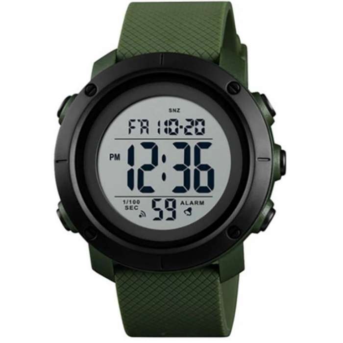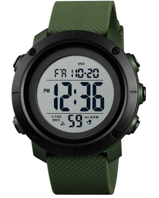 Skmei 1426AGWT– це електронний чоловічий годинник від виробника Skmei, який ідеально підходить для активного способу життя. Годинник має полімерний корпус чорного кольору, який є стійким до пошкоджень. Круглий циферблат також виконаний у чорному кольорі з білими цифрами та стрілками. Ремінець виконаний з каучуку в оливковому кольорі, що надає годиннику спортивного вигляду. Циферблат оснащений функцією другого часового поясу, а також показує рік, дату, день тижня та місяць. Додаткові функції включають секундомір, будильник і електролюмінесцентне підсвічування. Годинник оснащений полімерним склом, яке має високий ступінь міцності та захищає циферблат від пошкоджень. Формат часу може бути налаштований на 12 чи 24 години. Водонепроникність годинника становить 50 метрів, що дозволяє використовувати його під час плавання, але не під час дайвінгу. Вага годинника становить 46 грамів, що робить його легким та зручним для носіння. Годинник поставляється разом з транспортувальним пакетом та інструкцією, а для його живлення потрібна батарейка CR2025.