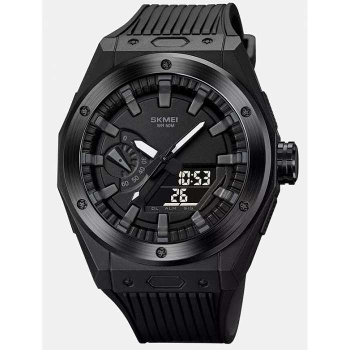 Чоловічий наручний годинник SKMEI 2103BKBK – багатофункціональна модель тактичного годинника, оснащена надійним кварцовим механізмом. Покриття стрілочного циферблата виконано з використанням органічного полікарбонатного скла, що має підвищену стійкість до ударів. Великою перевагою годинника є чорний круглий корпус, виконаний з нержавіючої сталі, що забезпечує довговічну їх експлуатацію. Зручність використання цієї моделі полягає в тому, що вона має підсвічування, секундомір, може витримувати дуже глибокі занурення (до 50 м), а ремінець підходить для різної за формою і повнотою зап'ястя руки.