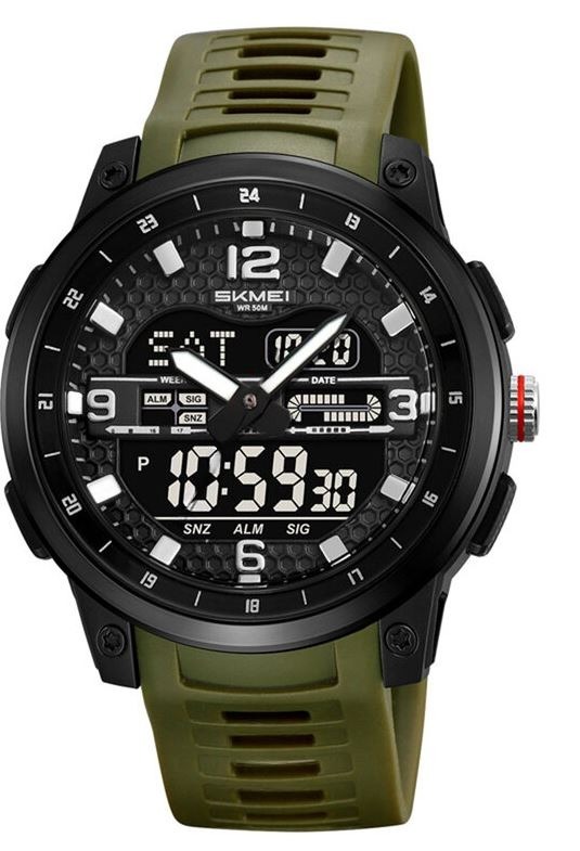 Пропонуємо вам стильний і функціональний наручний годинник Skmei 2401AG - ідеальний вибір для активних чоловіків, які цінують спорт і пригоди! Цей годинник поєднує в собі аналогове та цифрове відображення часу, що забезпечує максимальну зручність у використанні та чіткість інформації. Спортивний стиль годинника підкреслює їх динамічну природу, а кругла форма і чорний корпус, виконаний з високоякісного пластику, надають їм сучасного вигляду. Широкий зелений ремінець із силікону забезпечить комфортне носіння, ідеально підійшовши для занять спортом або повсякденного носіння. Годинник Skmei 2401AG оснащений безліччю корисних функцій: яскраве підсвічування дозволить вам легко дізнатися час у темряві, а будильник, календар, секундомір та таймер допоможуть організувати ваш день. Додаткова зручність надасть можливість встановлення другого часового поясу для тих, хто багато подорожує. Довжина ремінця становить 200 мм із шириною 21 мм, що забезпечує хорошу посадку на зап'ястя. Клас водонепроникності 5 Bar дозволяє не турбуватися про годинник під час дощу або водних процедур.