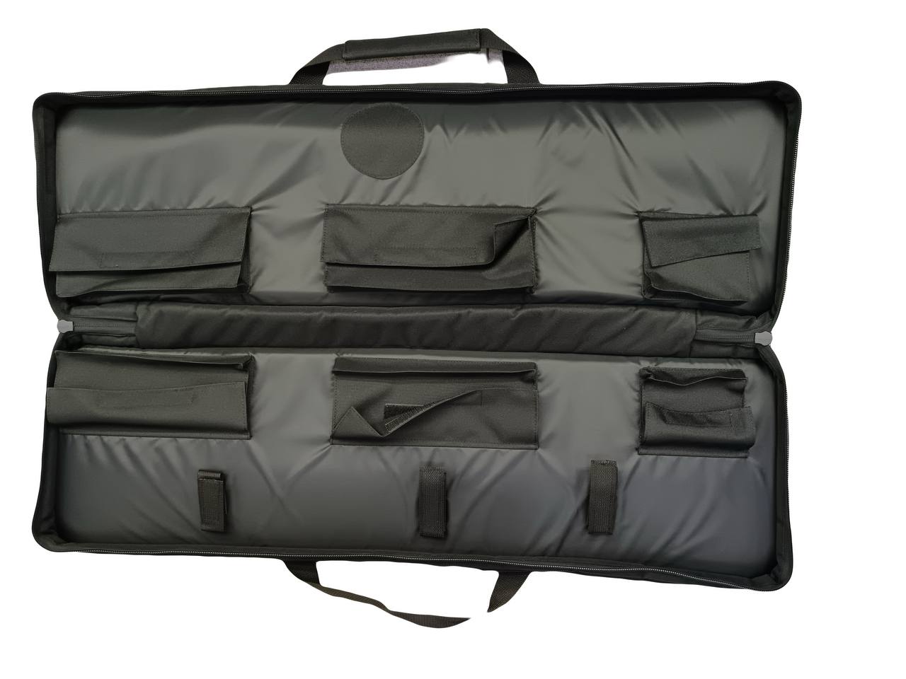 "Чехол Чемодан АКМ предназначен для транспортировки самозарядного карабина Сайга с нескладным прикладом и аналогов. В чехол помещается ружье с небольшим коллиматорным прицелом и с ДТК. Специфическая форма чехла маскирует содержимое. Чехол изготовлен из непромокаемой ткани с полиуретановой ПУ или ПВХ пропиткой. Для защиты оружия внутри вшит поролон толщиной 20мм. Есть крепления для приклада 3 шт – липа на ременной ленте. Также есть 6 карманов: 4 для магазинов 25х9х3 см и 2 размером 12х9х3 см. На подкладке пришито уплотнение для защиты от прорыва металлическими элементами оружия. Для переноски чехла предусмотрена ручка и ремень. Длина ремня регулируется при помощи пряжки.Размеры: 90х26х9 см "