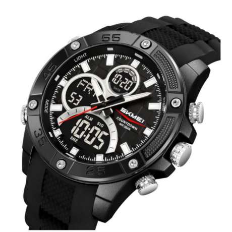 Наручные часы Skmei 2220AG совмещают агрессивный спортивный дизайн, мощный корпус и современную комбинированную индикацию, создавая красивый аксессуар для активных мужчин. Контрастное сочетание зеленого ремешка с черным корпусом и многоуровневым циферблатом формирует стильный милитари-образ, который привлекает внимание и подчеркивает характер владельца. Большой циферблат с аналоговыми стрелками и тремя электронными дисплеями обеспечивает удобное считывание времени, даты и других показателей в любых условиях. Контрастные шкалы и подсветка позволяют легко ориентироваться даже в темноте, что делает часы идеальными для тренировок, путешествий, активного отдыха и повседневной носки. Корпус выполнен из комбинации ABS-пластика и цинкового сплава, что гарантирует прочность и легкость, а ремешок из TPU эластичен, приятен на ощупь и устойчив к износу. Пластиковое стекло защищает от царапин и ударов, а водозащита 50 м позволяет не волноваться о дожде, влаге или случайных брызгах. Функционально Skmei оснащен всем необходимым для активного ритма жизни: точное время, дата, день недели, будильник, секундомер, хронограф, таймер обратного отсчета, формат 12/24 часов и электролюминесцентная подсветка для удобного просмотра в темноте.