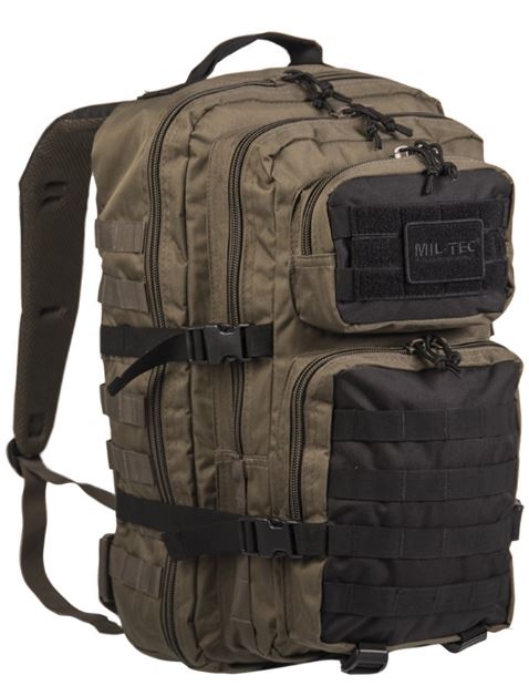 Тактичний рюкзак. Розміри: 510 x 290 x 280 мм. Ємність: 36 л. Вага: 1450 г. Виготовлений з міцного на розрив поліестеру, який з внутрішньої сторони додатково покритий ПВХ покриттям для захисту від вологи. Є 2 великих відділення, що закриваються двосторонніми блискавками для перенесення основного обладнання . Блискавки дозволяють глибоко розстібати рюкзак і забезпечують кращий доступ до вмісту. Усередині камер є менші відділення для забезпечення ефективного керування предметами, що переміщуються. Інші аксесуари можна зберігати в 2 передніх кишенях . Зверху є панель-липучка, завдяки якій можна кріпити нашивки та емблеми. Нижня більша кишеня оснащена органайзером для дрібниць. Рюкзак також має приховану кишеню на спині, що закривається на липучку, призначену для системи гідратації. Його також можна використовувати для приховування цінного обладнання. Сумісні лямки MOLLE/PALS розміщені як спереду, так і з боків рюкзака, що дозволяє зручно кріпити додаткове спорядження та збільшити місткість за рахунок додавання кишень або лотків. Бічні компресійні ремені дозволяють пристосувати рюкзак до вмісту, який ви носите. М'які регульовані лямки і спинка рюкзака забезпечують високий комфорт для користувача навіть при перенесенні великої кількості спорядження. Розміщені в них вентиляційні канали покращують циркуляцію повітря. Ремені шириною 5 см оснащені корисними D-кільцями. Регульований стегновий ремінь забезпечує рівномірний розподіл ваги. Найважливіші характеристики: - великий об'єм 36 літрів, - водонепроникне покриття зсередини, - велика кількість кишень і відділень, - кишеня для гідратації, - система MOLLE/PALS, що дозволяє розширюватися, - компресійні ремені, - вентильована спинка та лямки, - широкі регульовані лямки. Матеріал: 100% поліестер, ПВХ. Наповнювач: піна EVA.